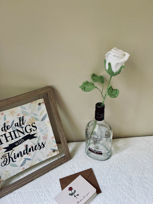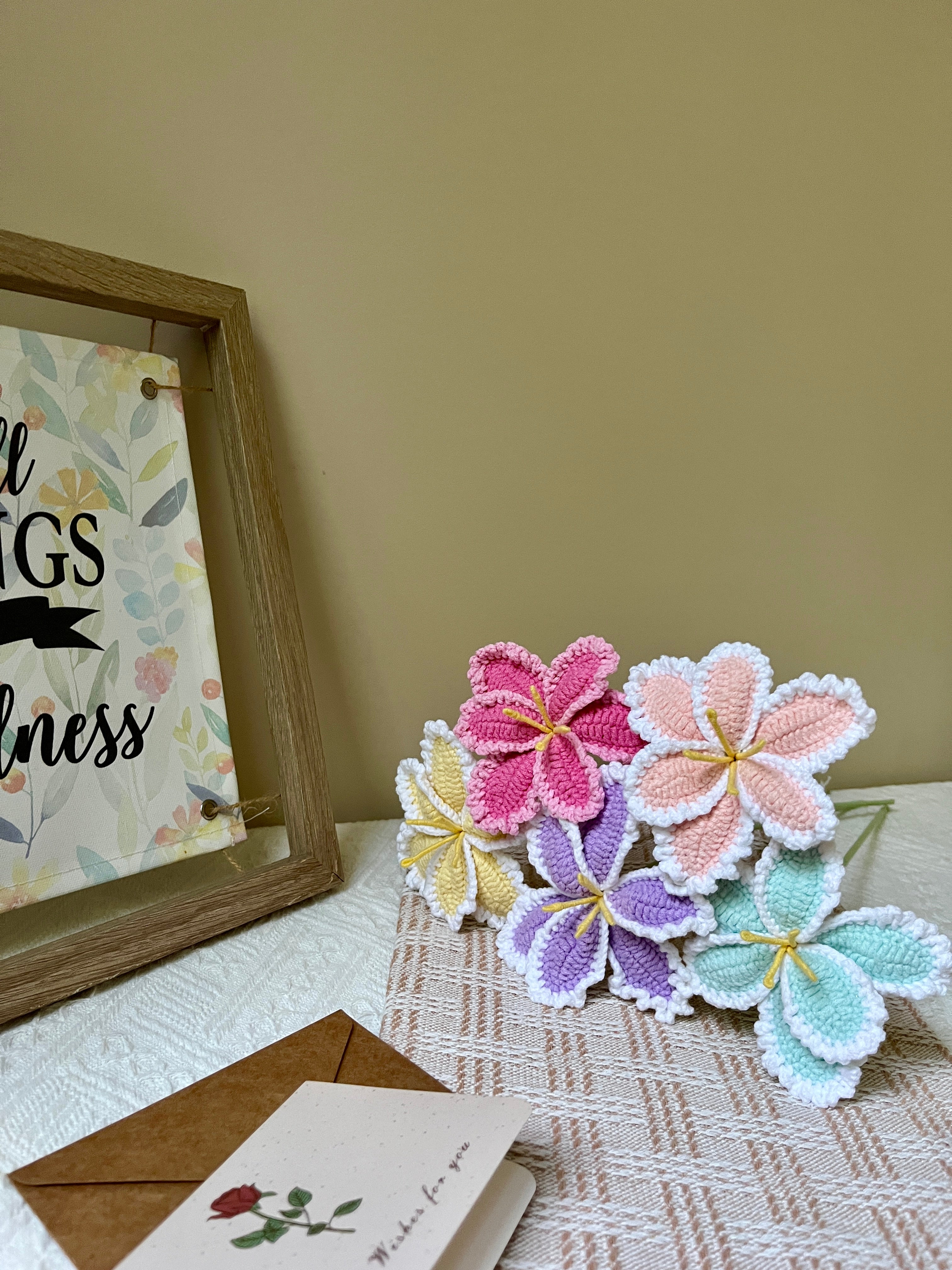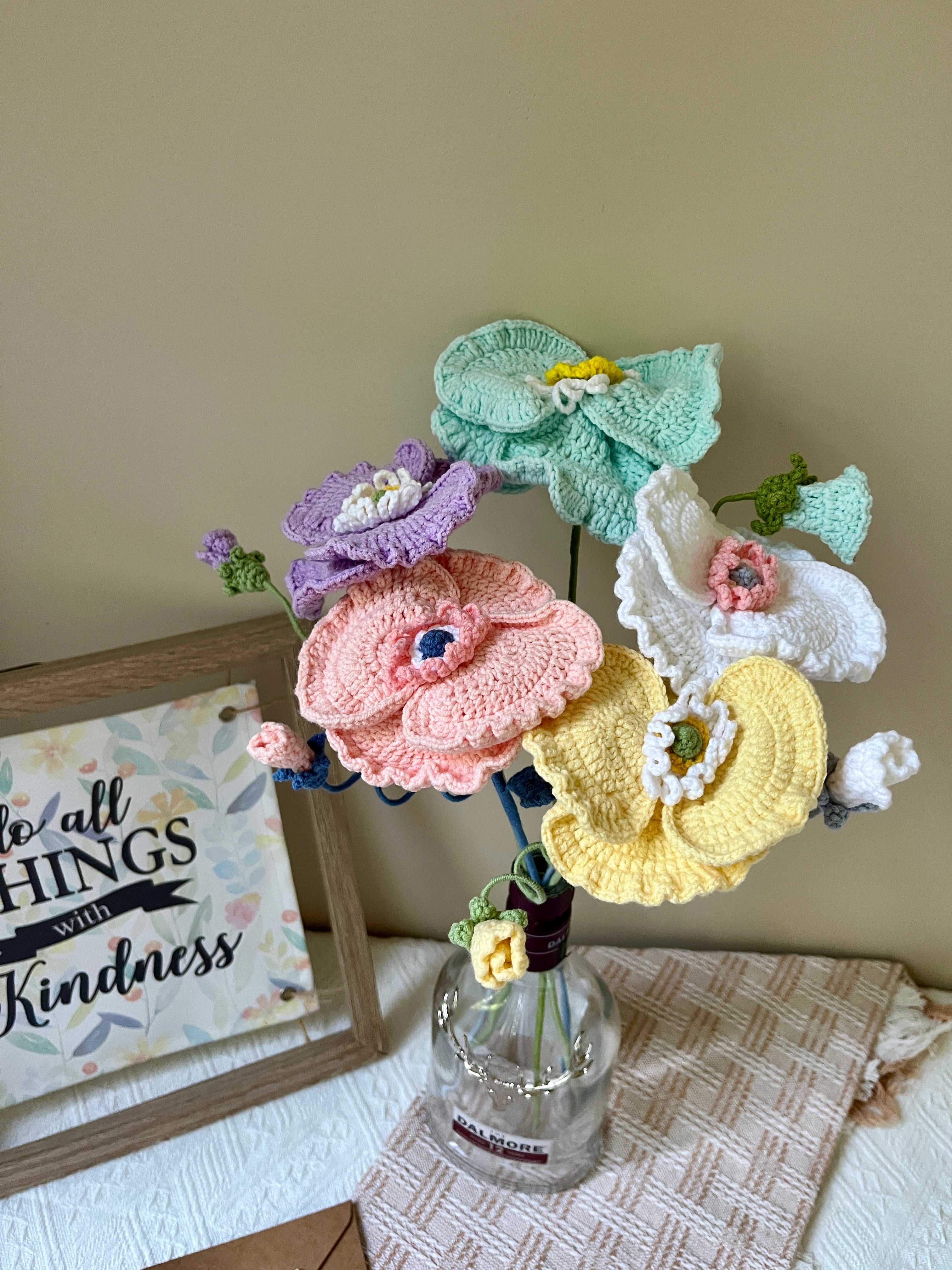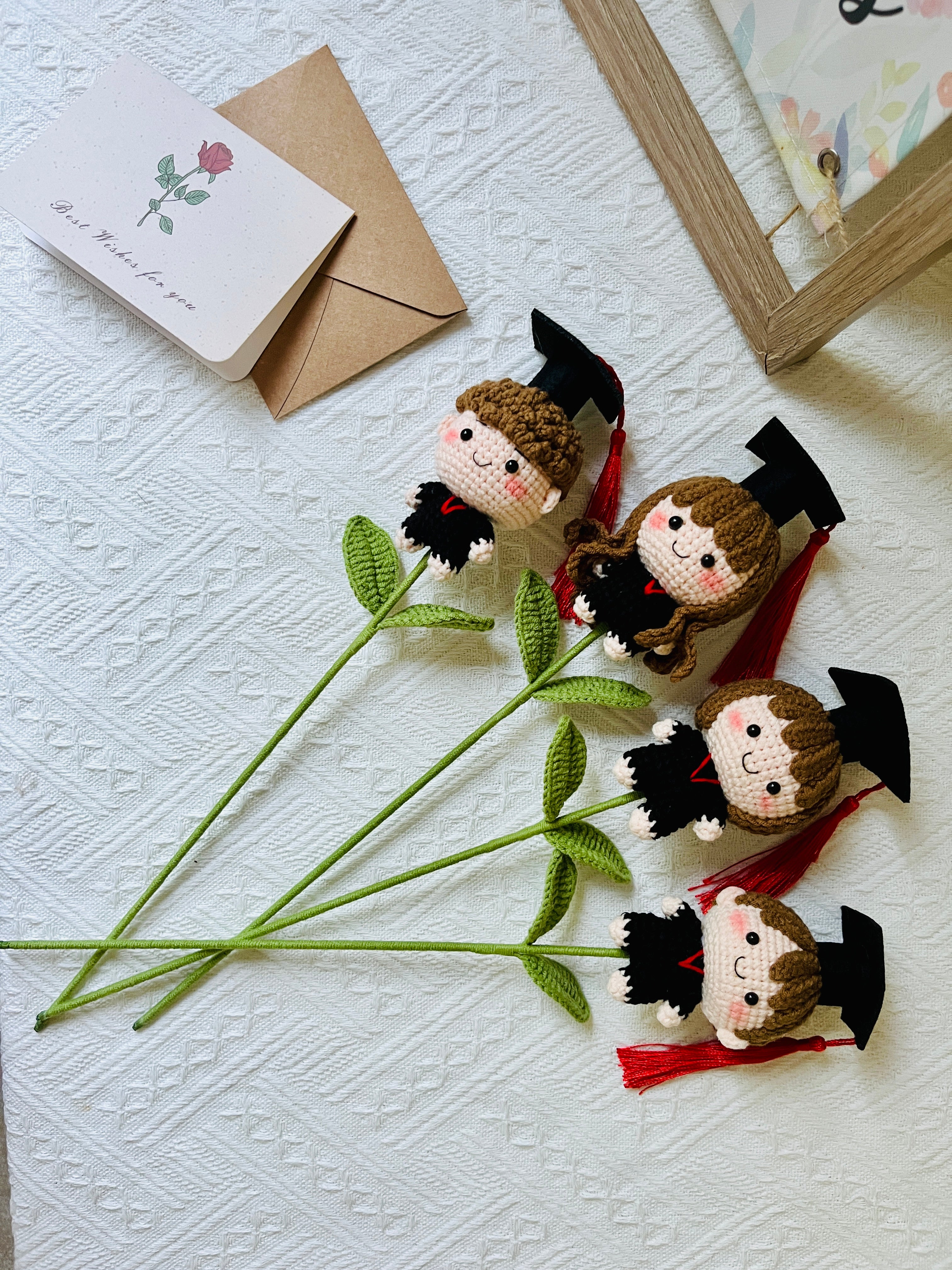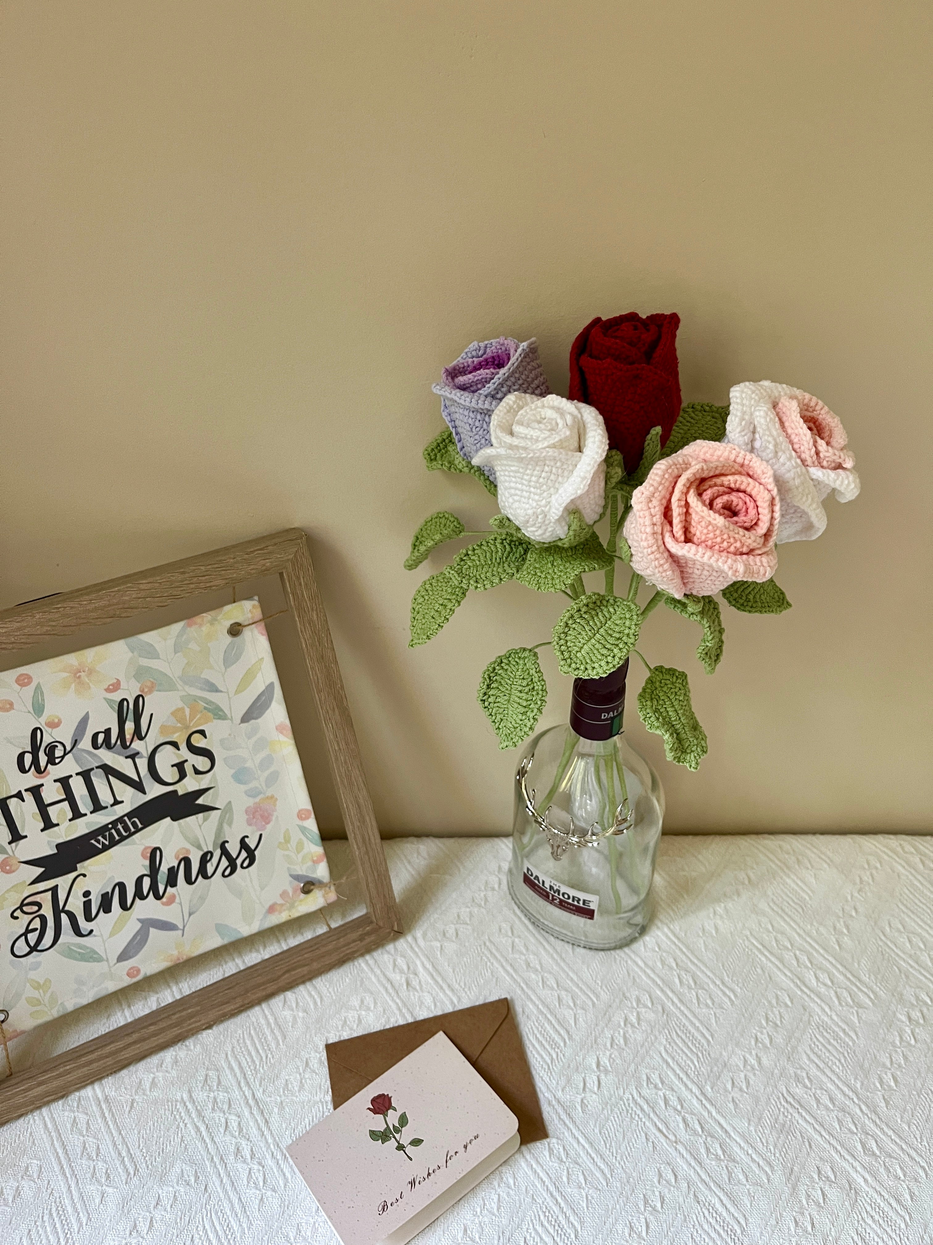 You can choose from the single crochet flowers and leaves to build a bouquet, a real unique one. Or contact us to customize bouquets with your stories and moments.